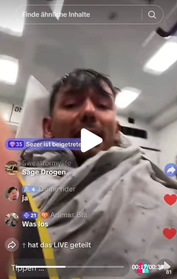 In einem TikTok-Livestream ist zu sehen, wie der Rapper im Rettungswagen liegt, völlig neben sich wirkt und immer wieder nach Hilfe ruft. Er spricht undeutlich und wirkt orientierungslos. Ein Sanitäter versucht ihn zu beruhigen, erklärt ihm, dass sie gleich im Krankenhaus ankommen. Dass er dabei einfach mitfilmt, kommt beim Sanitäter gar nicht gut an.
