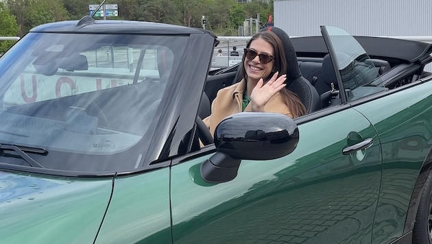 Sie ist mit einem Mini Cooper Cabrio unterwegs – stylish, sommerlich und perfekt für die Küstenstraßen!