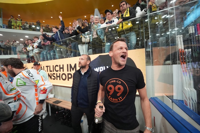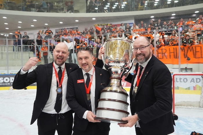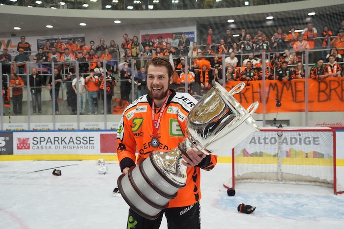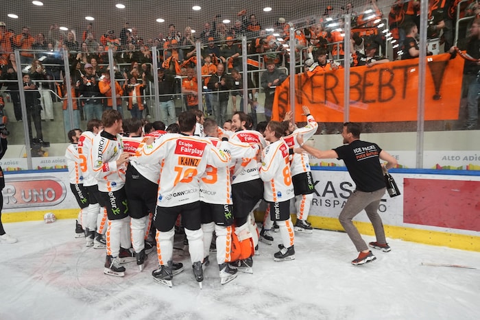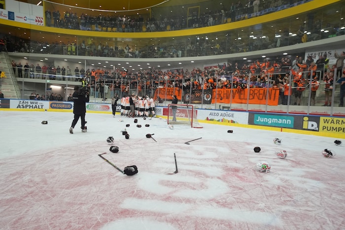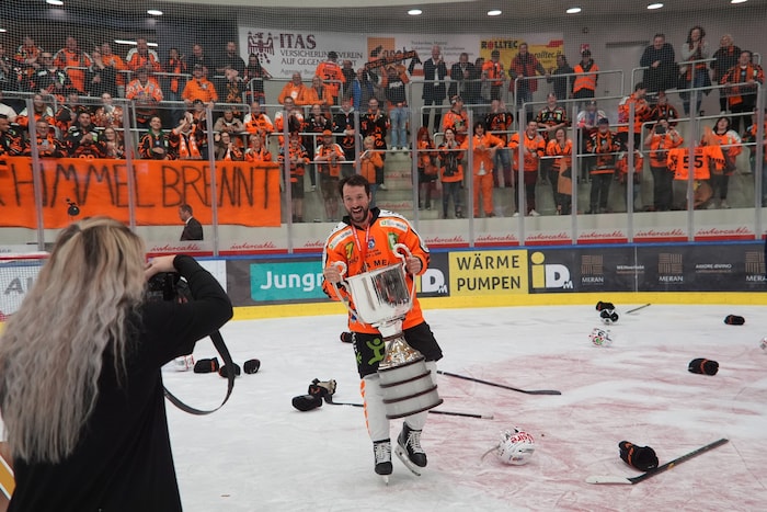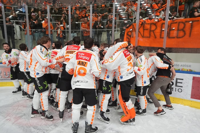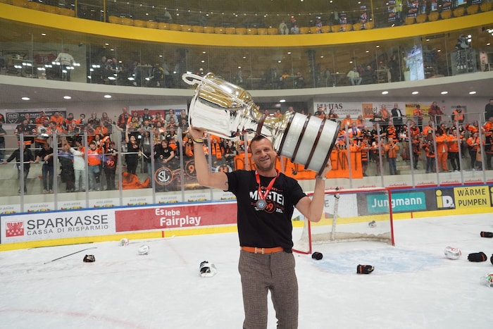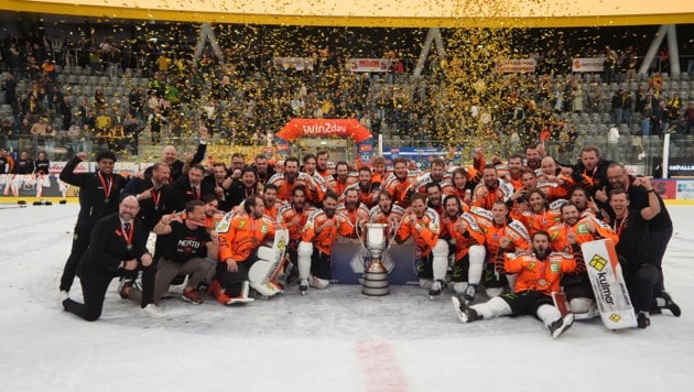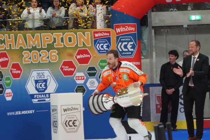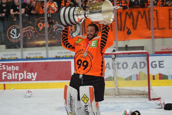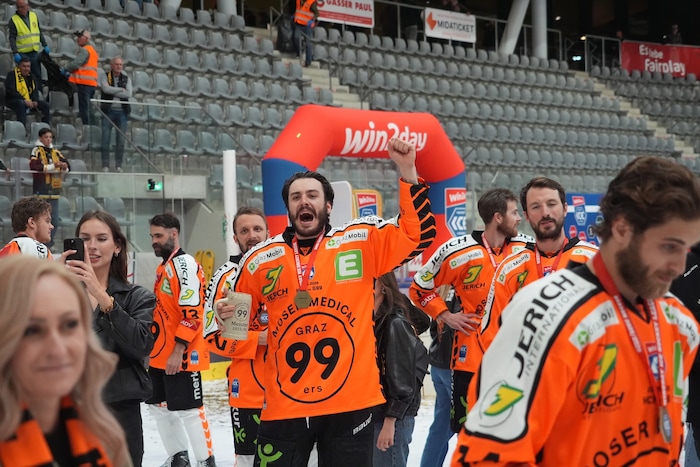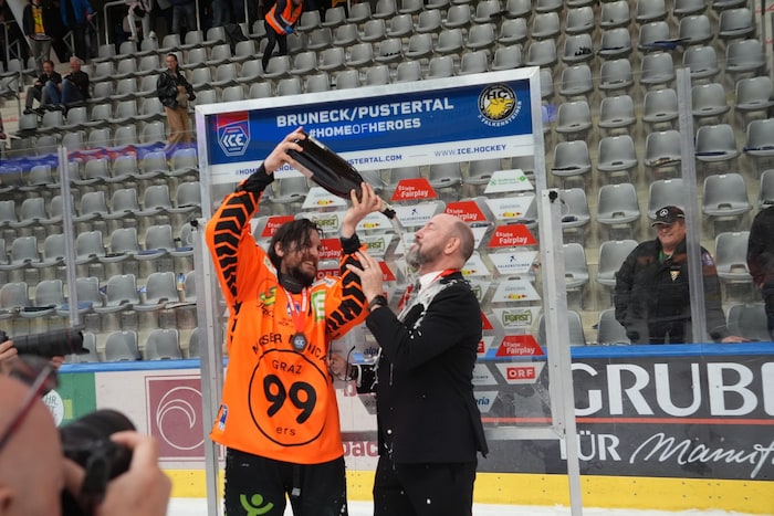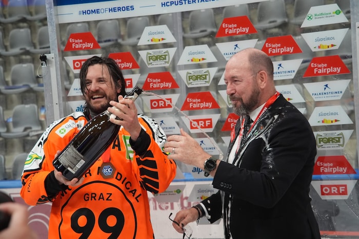 Exakt um 22.33 stemmten sie die Karl-Nedwed-Trophy in die Höhe, verwandelten die Graz99ers die Arena in Bruneck in eine Partyzone. Die Meister-Shirts waren längst gedruckt und vorbereitet. Auf der Tribüne fieberte wie zuletzt Super-Fan Andreas Gabalier („Die Mannschaft hat sich das sooo verdient“) mit. Ebenso wie rund 200 Fans aus Graz. Sogar ein Extra-Fanbus mit den Spielerfrauen und Verwandten der Cracks fuhr ins Pustertal.