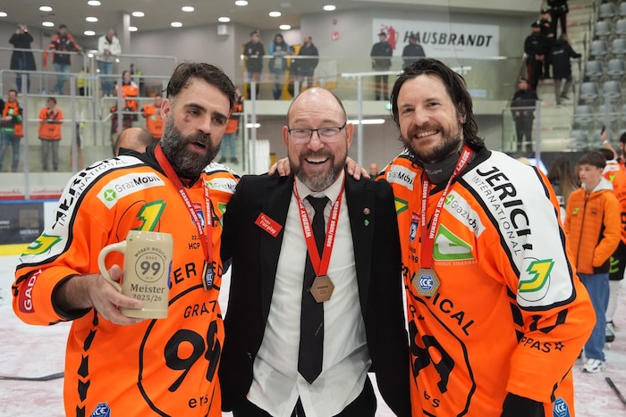 „Ich habe dieser Tage mit Hannes Kartnig telefoniert, der mir gesagt hat, dass er es nie geschafft hat. Ich habe es jetzt geschafft mit der Mannschaft. Es ist unglaublich!“ Grenzenloser Jubel, die pure Freude! „Ich bin so unglaublich stolz und so überglücklich, ein Teil dieser Mannschaft zu sein“, strahlte Kapitän Korbinian Holzer. Wie Stürmer Kevin Conley, der mit der „Krone“ vor der Finalserie um seinen Schnauzer gewettet hatte. Der Stürmer muss dieser Tage „Haare lassen“ – spätestens am Sonntag bei der Meisterfeier in der Grazer Innenstadt (Start 14 Uhr). Wird ihn wenig stören – laut „Krone“-Info wurde sein Vertrag verlängert.