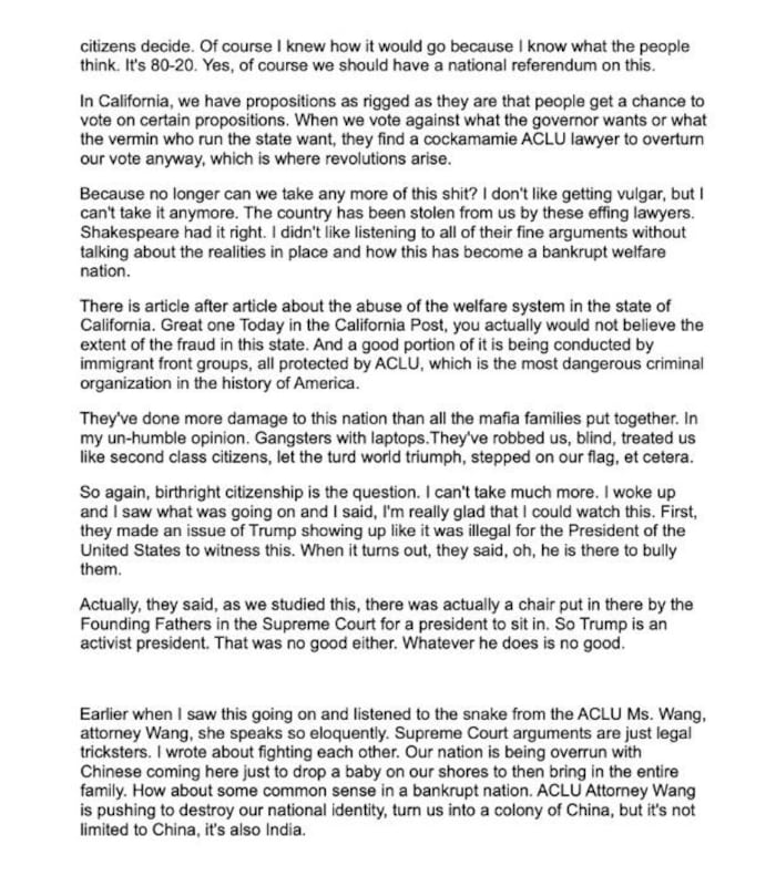In dem Text werden außerdem indische Einwanderer beschuldigt, keine weißen US-Amerikaner in ihren Unternehmen einzustellen und nur schlecht Englisch zu sprechen.