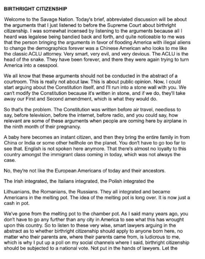 Trump hatte am Mittwoch (Ortszeit) einen Artikel verlinkt, der offenbar auf einen konservativen Podcaster zurückgeht. In dem Text wird das verfassungsmäßige Recht in den USA angeprangert, nach dem alle auf US-Boden Geborenen automatisch die US-Staatsbürgerschaft erhalten.