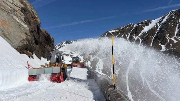 Der fünfköpfige Schneeräumtrupp kommt gut voran und hat die Passhöhe mit drei schweren Schneefräsen bereits nach gut einer Woche erreicht. Bei durchschnittlicher Schneelage sind dafür drei bis vier Wochen nötig.