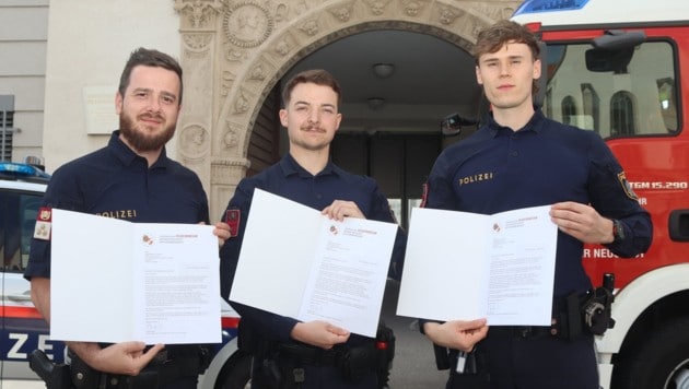 Weil sie als Ersthelfer keine Sekunde zögerten und die bereits anwesenden Florianis bei der Versorgung mit Löschwasser unterstützten, wurden die Polizisten von der Feuerwehr in Wiener Neustadt geehrt.