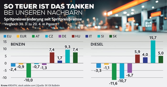 Neuen Daten nach sind diese nämlich seit Inkrafttreten der Verordnungen stärker gesunken als in all unseren EU-Nachbarländern. So sanken die Preise in Österreich um etwa 10 bis 12 Prozent, während sie in Ungarn, Italien und Slowenien sogar angestiegen sind (siehe Grafik oben). Ob und in welcher Form die Spritpreisbremse verlängert wird, wird nun verhandelt. Im Gegensatz zu ÖVP und SPÖ halten sich die NEOS aber bisher bedeckt.