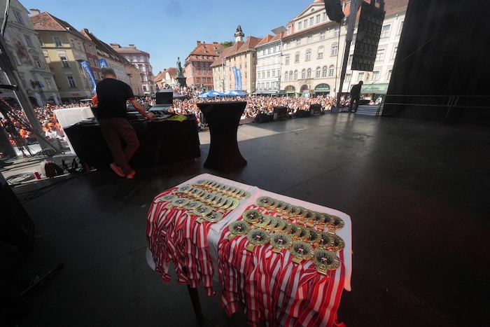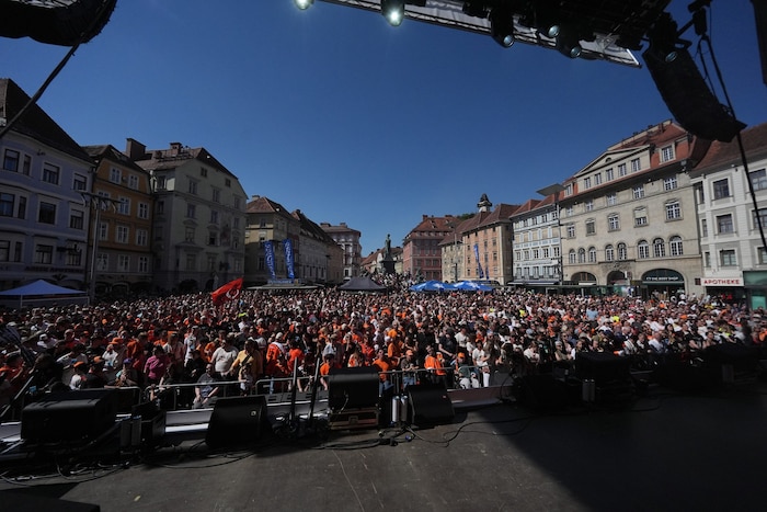 Der Tross setzte sich dann in Bewegung in Richtung Herrengasse, der Festakt bringt die 99ers zu einem Treffen mit Landeshauptmann Mario Kunasek, ins Rathaus zum Eintrag ins Goldene Buch der Stadt Graz und zum Treffen mit Bürgermeisterin Elke Kahr – und natürlich zum feierlichen Akt auf dem Hauptplatz, den dann auch Superstar Andreas Gabalier begleitet. Der Volks‐Rock’n’Roller ließ es bei seiner Version von „Steiermark“ von Gert Steinbäcker inmitten einer Flammenwerfer-Show stimmungsmäßig auf dem Hauptplatz „brennen“.