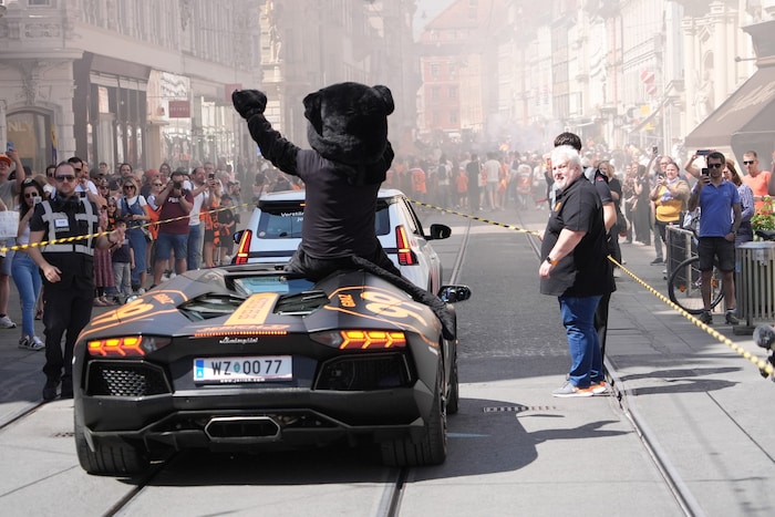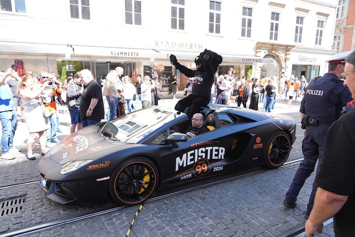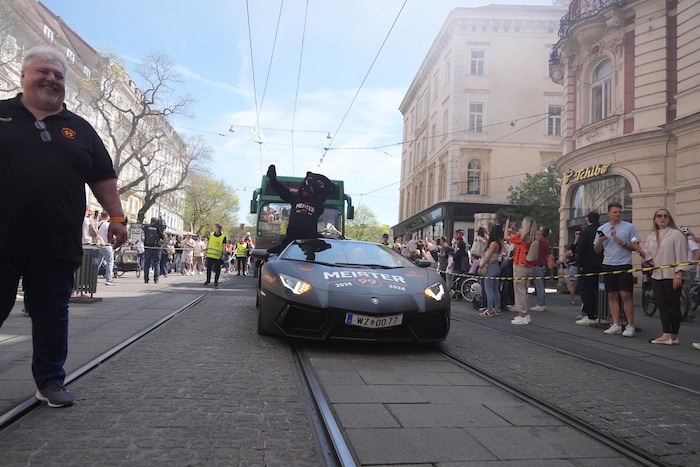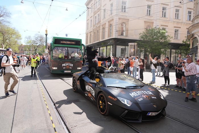 Der Cabrio-Bus rollte in der Kaiserfeldgasse vor, sofort umzingelt von Hunderten 99ers -Fans, die mit ihren Helden die Sternstunde des Klubs gemeinsam feiern wollten. Dann wurde es laut, der Lamborghini von Klub-Boss Herbert Jerich, speziell für die Meisterfeier gebrandet, fuhr vor, um das Klubmaskottchen, Pucky, einsteigen zu lassen.