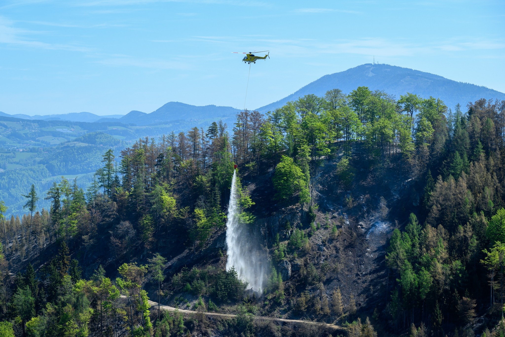 Montagfrüh bat Philipp Helm, der dem weltbekannten Stift und Waldeigentümer als Abt vorsteht, sogar um Gottes Segen für die Löscharbeiten und um eine unfallfreie Rückkehr der Feuerwehrleute. Über 300 Kräfte standen am Montag wieder am Berg, in schwer zugänglichem Gelände, im Einsatz – dazu sieben Hubschrauber, etwa vom Bundesheer. Doch das Feuer hat sich allen Bemühungen zum Trotz weiter ausgebreitet. Mittlerweile stehen 70 Hektar in Flammen, am Sonntag waren es noch 50.