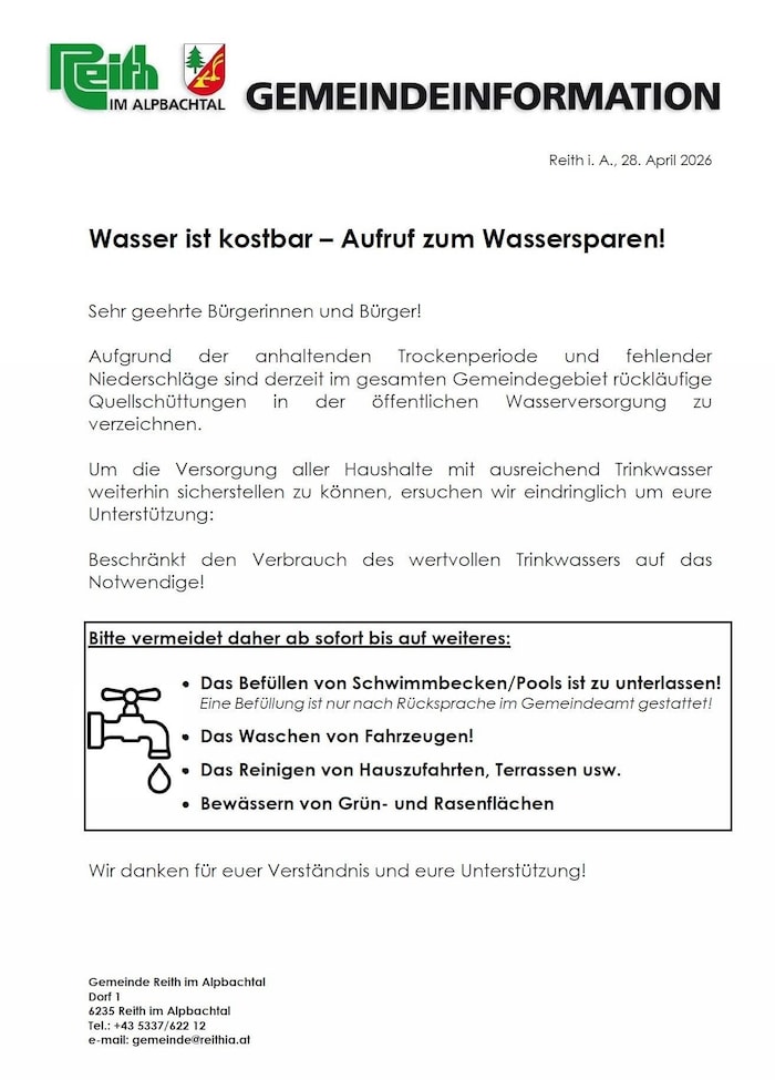 Auch in der Gemeinde Reith im Alpbachtal ruft die Gemeinde dazu auf, Wasser zu sparen. Auch hier sind die Gründe die anhaltende Trockenperiode und fehlende Niederschläge. Im Aufruf heißt es weiter: „Um die Versorgung aller Haushalte mit ausreichend Trinkwasser weiterhin sicherstellen zu können, ersuchen wir eindringlich, um eure Unterstützung.“