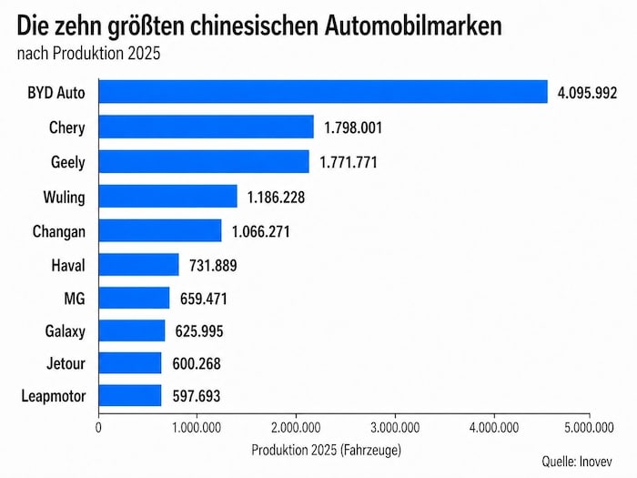 Mit großem Abstand an der Spitze der Produktionsrangliste steht demnach mit gut vier Millionen Fahrzeugen die Marke BYD aus dem gleichnamigen Konzern. In Österreich bereits bestens etabliert. Ebenso wie die SAIC-Tochter MG Motor, die insgesamt auf Platz sieben rangiert.