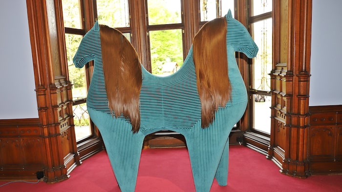 Im Obergeschoß treten sakrale Objekte aus einer Wand aus langen Haaren hervor, hier geht es um „Fetische“. Aber auch um Zuschreibungen und Bilder von Verwilderung, Einsamkeit und Sünde – wie schon bei Maria Magdalena angedeutet.