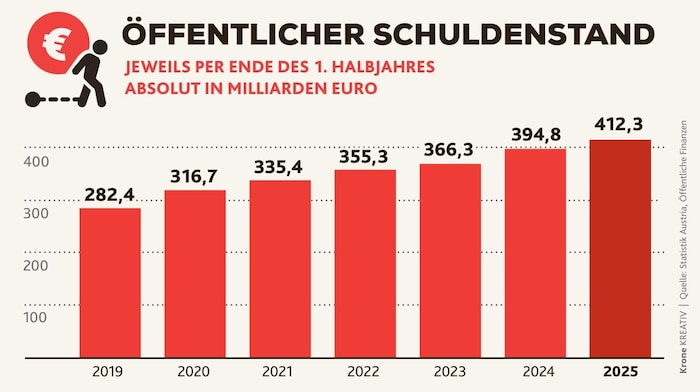 Die Staatsschulden schießen weiter in die Höhe: Im ersten Halbjahr 2025 stieg der Schuldenstand Österreichs auf 412,3 Milliarden Euro. Pro Kopf sind das 44.800 Euro. Vor einem Jahr waren es 395 Milliarden Euro, 2019 gerade einmal 282 Milliarden Euro. Die Schuldenquote beträgt mittlerweile satte 82,3 Prozent der Wirtschaftsleistung.