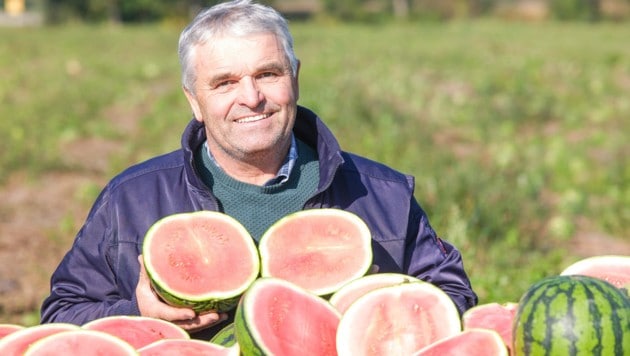 Rund 15.000 Wassermelonen liegen auf dem Acker von Ernst Aschauer in Hartkirchen und warten nur darauf, geerntet zu werden. Es sind prächtige Exemplare, bis zu drei Kilo schwer mit saftig rotem Fruchtfleisch und kaum Kernen. Und ihr Geschmack ist wunderbar süß.