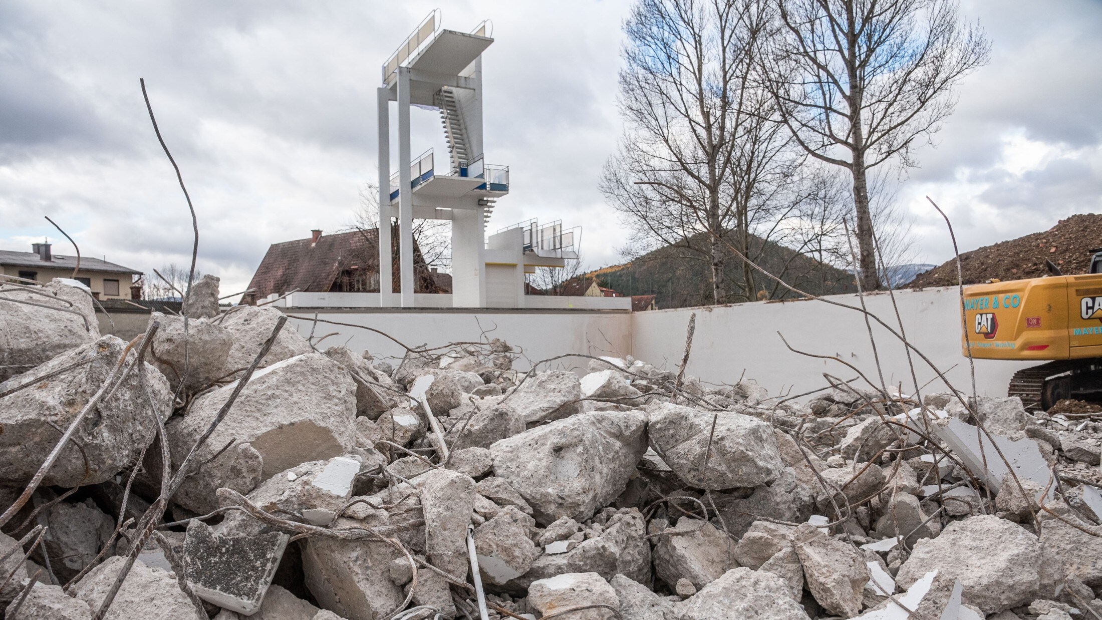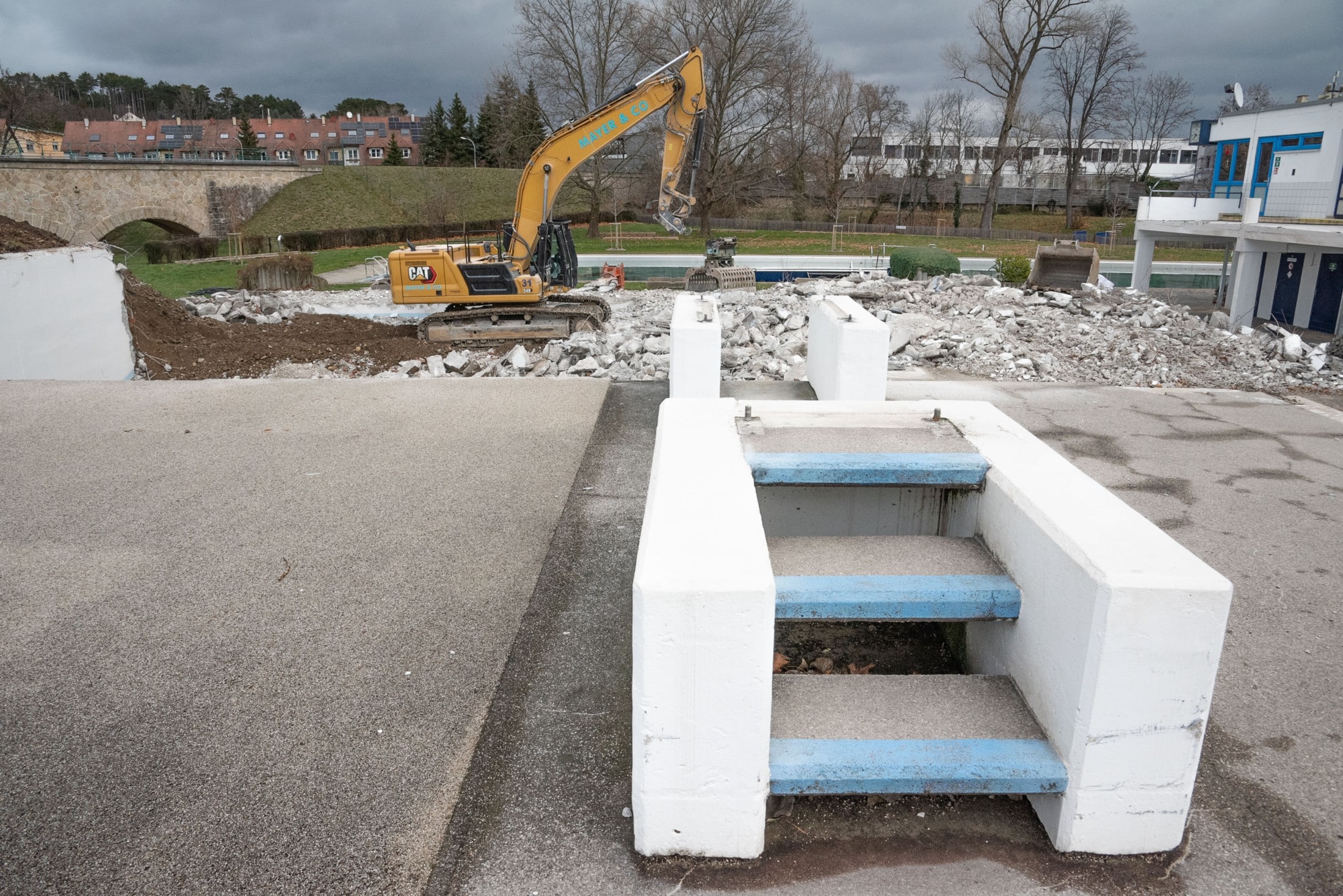 Vorbei mit den coolen Typen, die noch im Sommer vor einigen Jahren ihre tollkühnen Sprünge vom Fünf- und Zehnmeterbrett im Ternitzer Freibad wagten. Seit dieser Woche ist das dazugehörende Becken endgültig Geschichte. Die Abrissarbeiten sind im vollen Gange.