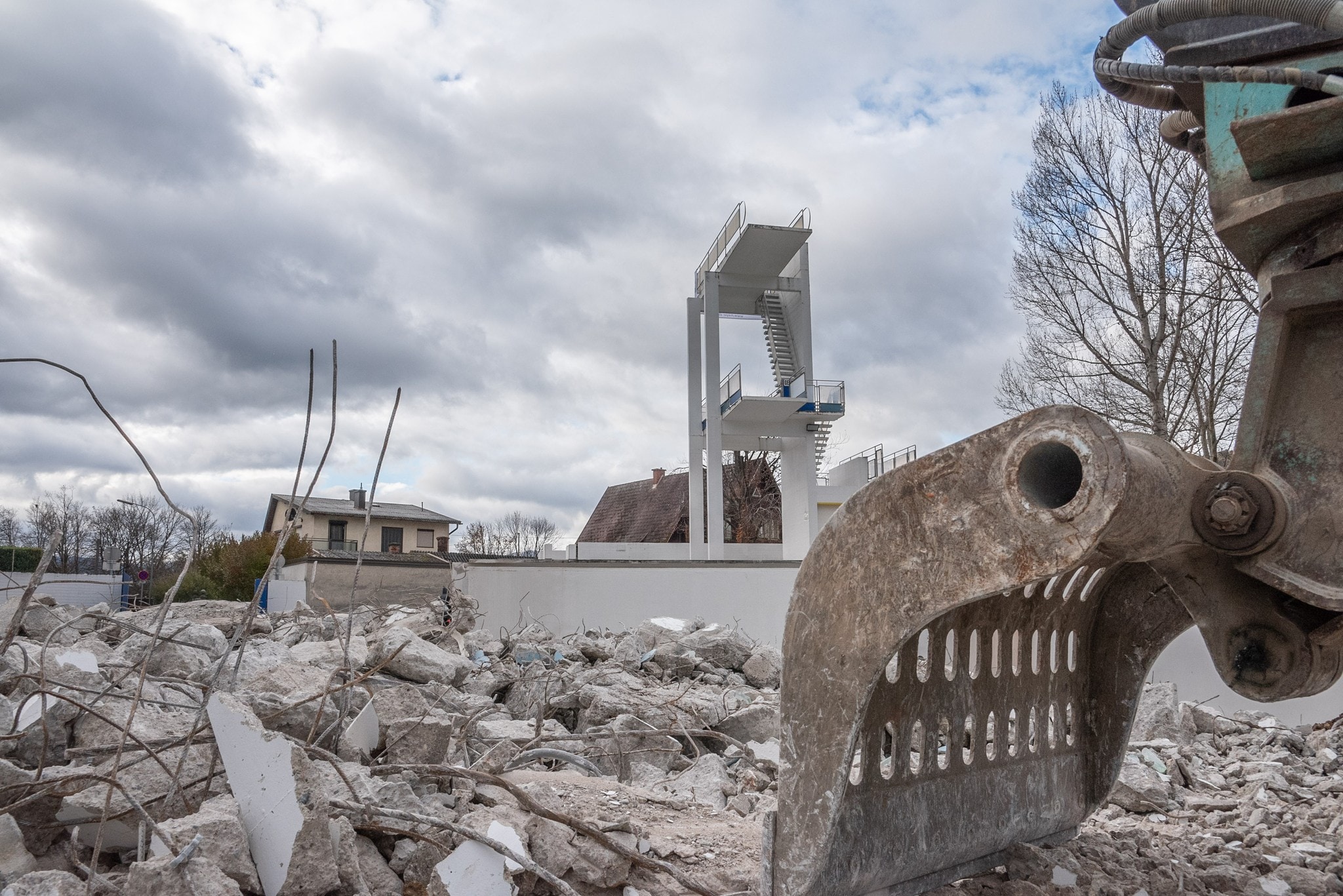 Zur Erinnerung: Auch der beliebte Zehnmeterturm des bekannten Architekten sollte den Baggern zum Opfer fallen. Nach Protesten wird dieser jedoch nun erhalten.