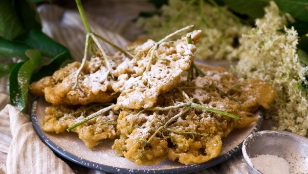 Die Holunderblütendolden durch den Backteig ziehen und anschließend im heißen Fett goldgelb ausbacken.