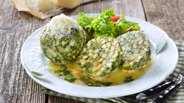 Semmelknödel lassen sich mit einer Reihe von Extra-Zutaten beliebig variieren. Statt Spinat passen ebenso gut Grammeln, Schinken, Champignons, Bärlauch etc.