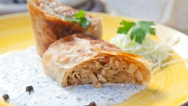 Etwas Öl in einer Pfanne erhitzen, darin die Zwiebel-, Knoblauch- und Speckstücke sowie das Weißkraut dünsten, bis das Kraut weich, aber noch bissfest ist. Diese Mischung mit Salz, Pfeffer aus der Mühle und Kümmel abschmecken. Beiseite stellen und etwas abkühlen lassen. Das Backrohr auf 180° C vorheizen.