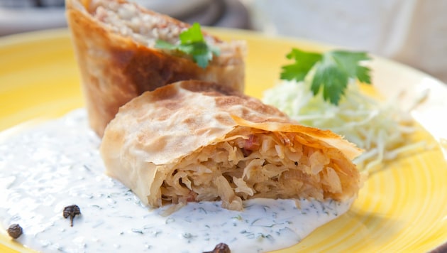 Nun den Sauerrahm, das Joghurt, etwas Salz und Pfeffer sowie den Schnittlauch in einer Schüssel verrühren, die Knoblauchzehen dazupressen. Diese Sauce noch mit Zitronensaft abschmecken und zum Krautstrudel servieren. Zum Schluss noch mit Petersilienblättern garnieren.