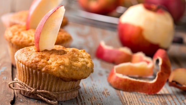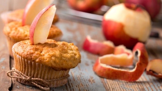 Zum Schluss eine Apfelspalte in die Muffins stecken und servieren.