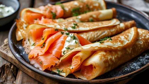 Zum Schluss jede Palatschinke dünn mit der Creme bestreichen, den Lachs darauf verteilen. Locker einrollen und mit frischen Kräutern bestreuen.