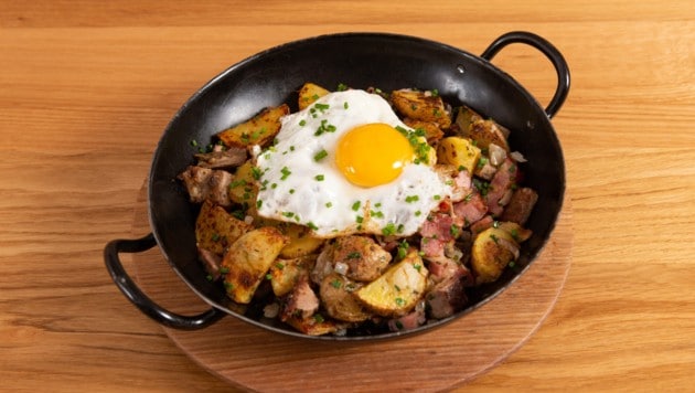 Das Gröstl ist gewissermaßen der Inbegriff der Wiederverwertungs-Kulinarik. Schon der Name klingt verdächtig nach „Restl“. Das ist aber nur Zufall, in Wahrheit leitet er sich vom „Rösten“ ab. Genau genommen braucht es gar kein Rezept für dieses Gericht, denn man kann fast alle Überbleibsel verwenden, solange man sich an die Dreiteilung hält: Fleisch oder Wurst einerseits; zweitens Kohlehydrat-Träger wie Erdäpfel, Teigwaren, Knödel oder alle drei zusammen; drittens kommen Eier drüber. Alles andere ist Sache des Geschmacks – oder des Kühlschrankinhalts.