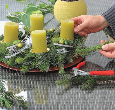 Einen Adventkranz selbst zu machen, gelingt mit wenigen Naturmaterialien. Man braucht einen „Rohling“, also einen Stroh- oder Weidenkranz, 15 cm lange Tannenzweige, grünen Draht, vier Kerzenhalter und Deko. Zunächst den Draht am Rohling befestigen, indem man ihn damit umwickelt. Dann kann man damit beginnen, die Zweige anzulegen. Neue Zweige über und unter die bereits vorhandenen stecken. Lücken können mit kleinen Zweigen gefüllt werden. Am Schluss sollte der Draht nicht mehr erkennbar sein. Dann müssen noch die Kerzenhalter befestigt werden. Abschließend kann man den Kranz mit Tannenzapfen, Zimtstangen, Orangenscheiben, Schleifen oder Hagebutten verzieren.
