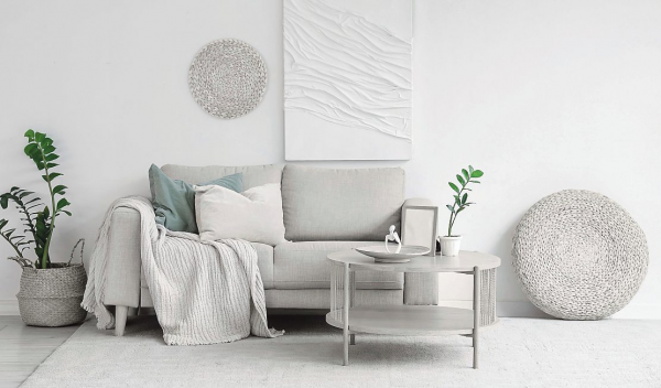 • Textilien wie Kissen, Decken oder Teppiche in natürlichen Naturtönen oder Pastellfarben schaffen weiche Kontraste.