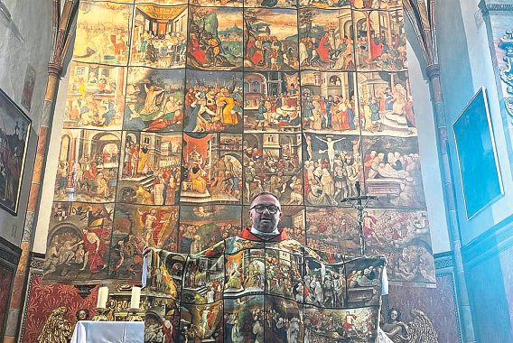 Ein Messgewand für Slawomir Czulak, den Provisor der Stiftskirche Millstatt, hat Künstlerin Carolin Berger kreiert. Darauf abgebildet ist das Millstätter Fastentuch, das noch bis Ostern in der heimischen Kirche den Altar verhüllt.