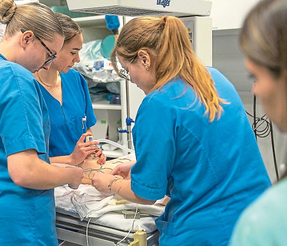 Trainings zu einzelnen Grundfertigkeiten, wie zum Beispiel atemerleichternde Positionierungen, Monitoring von Kleinkindern bis hin zu Jugendlichen, sowie die strukturierte Übergabe bereiteten die Studierenden auf den Ernstfall vor. An jeder Station erhielten die Teilnehmer Instruktionen von einem Team aus jeweils einem diplomierten Gesundheits- und Krankenpfleger sowie einem Facharzt des pädiatrischen oder neonatologischen Fachgebietes. Die erlernten und vertieften Grundfertigkeiten konnten dann im Rahmen von Übungsszenarien von den Studierenden übertragen und angewendet werden.