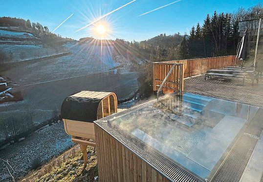 Im neuen Outdoor-Whirlpool des Adults-Only Boutiquehotels Königswieserhof treibt man bei 35 Grad dem Panorama entgegen - über Wiesen, Wälder und die stille Landschaft des Mühlviertels.