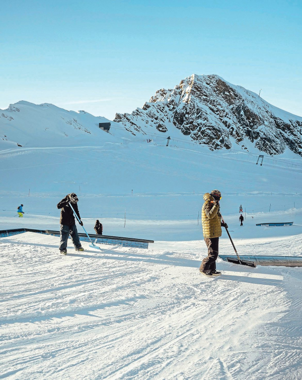 Und tatsächlich: Während sich unten im Tal die Après-Ski-Gäste am Glühwein wärmen, graben sich oben am Gletscher die Shaper in den Schnee. Nacht für Nacht, wenn die Pisten leer sind, wird modelliert, gefräst und gefeilt – bis der Park wieder bereit ist für die Stars der Szene.